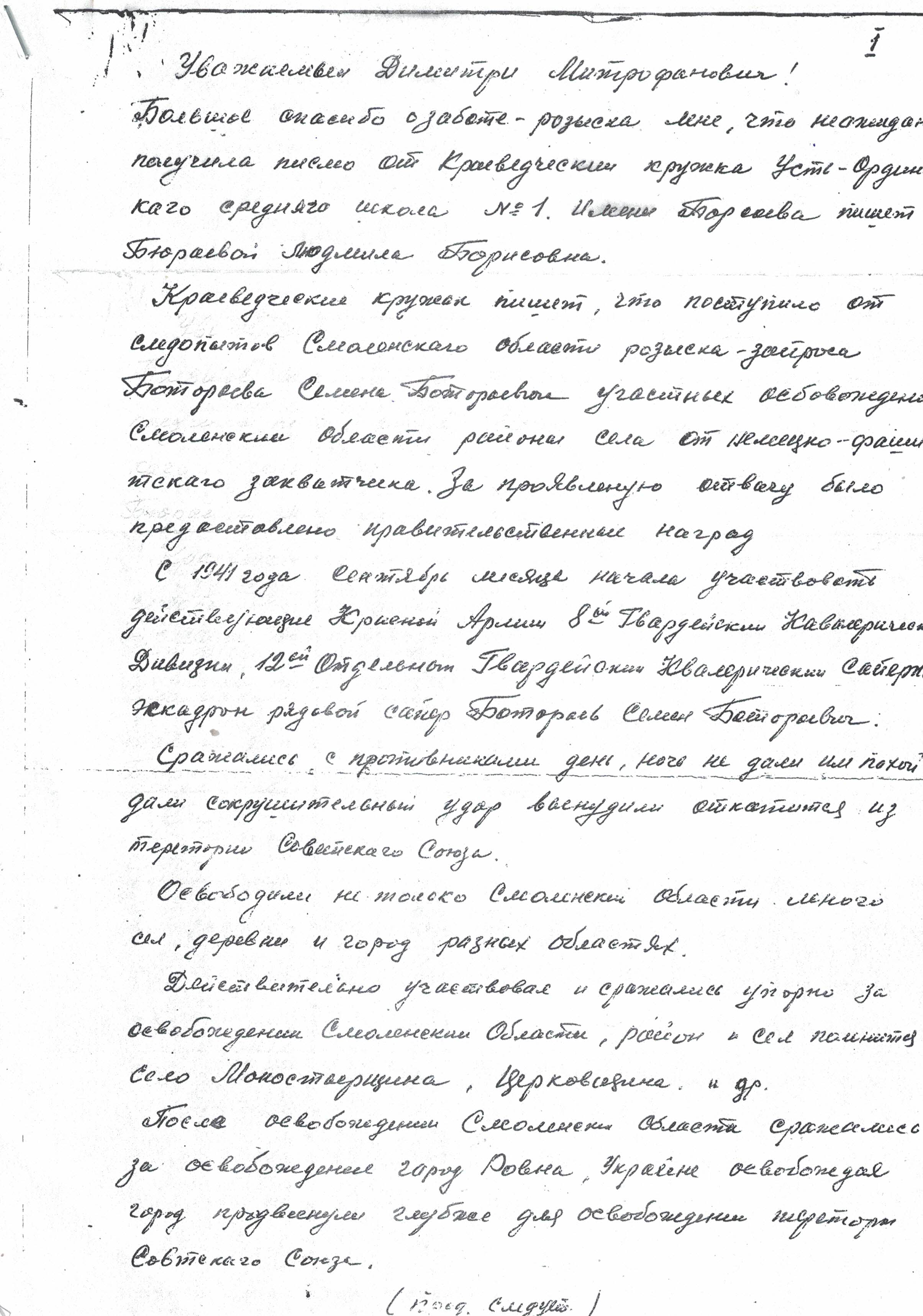 Я знаю многих из уроженцев Бурятии, которые защищали Смоленщину, древнюю русскую землю, от немецких фашистов. Первым среди них назову баргузинца Гуражапа Очирова, командовавшего там крупным партизанским отрядом. Орденом Ленина увенчаны его боевые заслуги. Теперь вот к списку прибавился Семен Ботороев, бывший рядовой 8-й гвардейской кавалерийской дивизии 6-го Краснознаменного ордена Суворова кавалерийского корпуса.