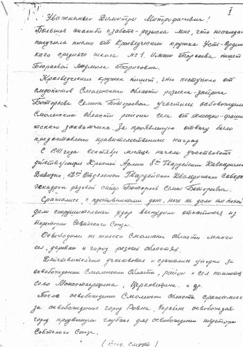 Публикация о нем, пожалуй, первая в нашей газете. Зато хорошо знают нашего земляка на Смоленщине. Со школьниками села Монастырщина, в боях за которое он проявил высокую воинскую доблесть, у него регулярная переписка. В районной газете «Ленинское знамя», выходящей там, был напечатан большой очерк под названием «Солдат из Бурятии», который заканчивается такими трогательными словами: «В этот торжественный и радостный для нас день – день освобождения Смоленщины – мы шлем ветерану Великой Отечественной войны Семену Ботороевичу Ботороеву, принимавшему участие в освобождении нашего района от фашистских захватчиков, свои сердечные поздравления. Долгих лет Вам жизни, дорогой Семен Ботороевич, доброго здоровья!».