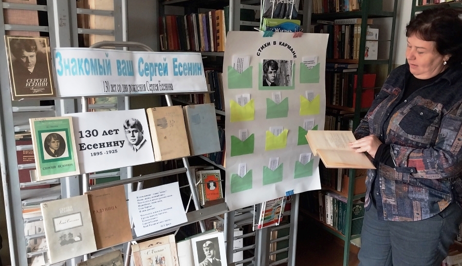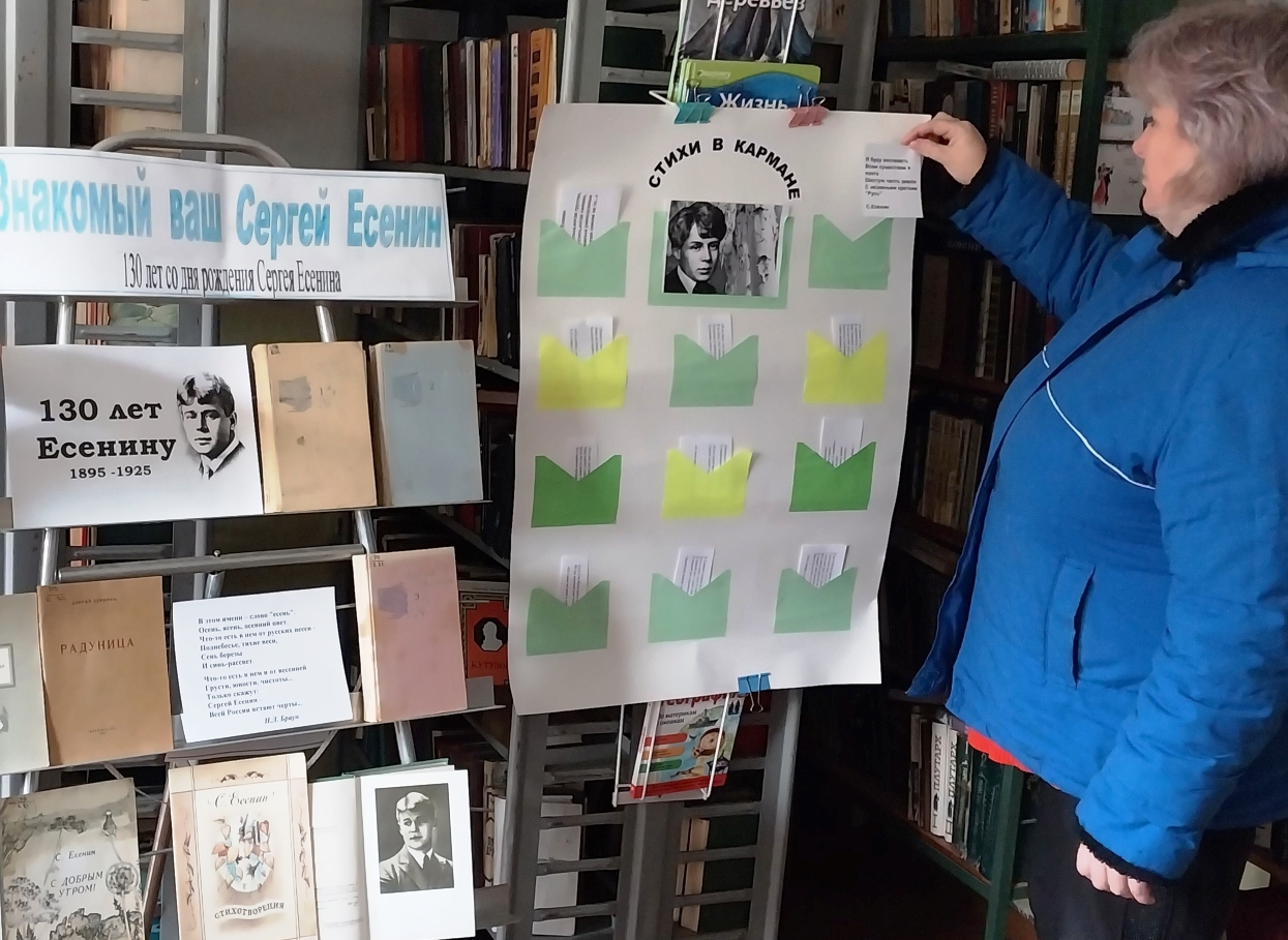 К 130‑летию со дня рождения Есенина в Новомихайловской библиотеке прошел День поэта «Знакомый ваш Сергей Есенин». К мероприятию оформлена книжная выставка с одноименным названием, стенд «Стихи в кармане», где представлены самые яркие строки из нестареющей Есенинской лирики.